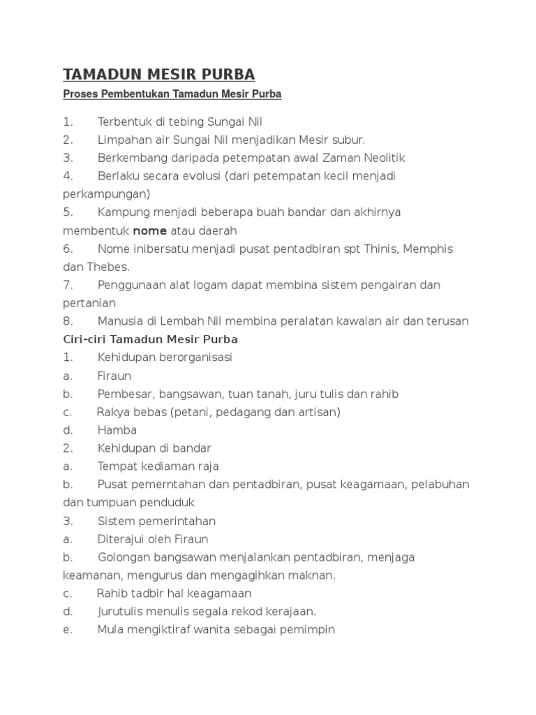 Sejarah Form 4 And Form 5 Notes from reader015.docslide.net Sejarah tamadun mesir purba serta sumbangan tamadun tersebut yang memberi inspirasi kepada teknologi zaman kini. Alat logam membantu mereka membina parit dan pengairan. Penggunaan alat logam membolehkan mereka membina sistem perparitan dan pengiran yang baik untuk pertanian. Lembah sungai selalu dipilih sebagai lokasi tempat kekal kerana kesuburan tanah untuk tujuan pertanian. Kemunculan tamadun awal manusia lesson 4: Pemerintahan dikuasai oleh kuasa asing. Terangkan proses pembentukan mesir purba. V proses pembentukan tamadun manusia bermula apabila manusia mulai menyesuaikan diri dengan alam sekitar.